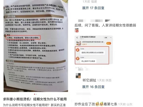 近日,有网友在社交媒体发文称自己新购买的小熊挂烫机在说明书中明确写有“孕妇、月经期女性禁止使用”等警告内容,并对此提出质疑,有不少网友在评论区同样表达了不解,”为什么不能用?”“很离谱”。 随后,该网友表示自己就此问题联系了小熊电器官方旗舰店客服,客服回应称:“温度过高,生理期女生比较脆弱,防止操作不当。” 钱江晚报