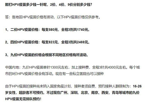 本来是看到论坛有人说相比四价,二价性价比更高,我就去稍微搜了一下,毕竟现在那么缺苗,九价就更不用说了,而且超过26了就不得行。话说一直以为都以为HPV只有女的可以打,刚刚才发现男的也可以,纯粹好奇,真的有男的去打嘛??会不会听到就觉得这是女的才打的。。。 既然去了解了,顺便贴下价格,有需要打的亲自己去了解哈,建议有苗了就早点去接种~