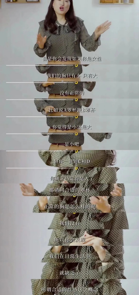分享自胡辛束 如果你最近几年在看恋综,那你肯定见过一位叫沈奕斐的女教授。前两天在小红书上看到一张她讲课的截图,瞬间吸引了我的注意:“我们在日常生活中,缺乏了所谓合适的性感这个概念。”“我们的胸只有小,只有大,没有正常的。说A罩杯和B罩杯,就是小,但你一旦谈到C和D,立马觉得是大了。”“对于性感的警觉,使得我们对于自己魅力本身是想要藏起来的,而不是去打开来的。”