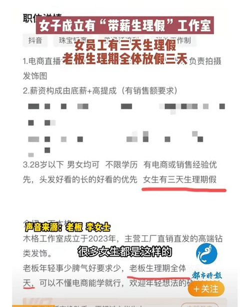 3月8日(采访),辽宁沈阳,女子成立有“带薪生理假”工作室,女员工享有三天生理期假,老板生理期时全体放假三天。老板李女士介绍:“我生理期会痛经,吃了药都站不起来,有很多女生都是这样,生理期没办法很好地完成工作,与其在那难受不如让她好好休息。”李女士还称:“原来我上班的时候,不会因为这种事情就给我们放假,也不会得到理解。所以当我成立工作室的时候,我就有这样的想法,我觉得女生应该有这个权利。”