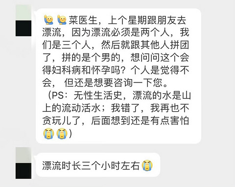 “上个星期跟朋友去漂流,因为漂流必须是两个人,我们是三个人,然后就跟其他人拼了,拼的是个男的,想问问这个会得妇科病和怀孕吗?”呃,现在的人是完全没有常识的么,都穿着裤子呢,水里没有小蝌蚪