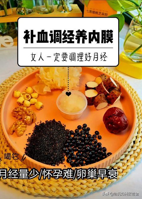 看到中医分享的,给月经量少、怀孕难、卵巢早衰的朋友们推荐一款补血调经、养内膜的食疗汤方。这是一个可以帮助大家修复子宫内膜、调理月经、预防卵巢早衰的方子。口感软糯丝滑,成本低,做法也很简单~ 材料:莲子、红枣、核桃、黑豆、山药、银耳、黑芝麻、花胶 做法:将所有食材洗净放入锅中,加入适量清水炖煮1个小时左右即可出锅食用。也可以用破壁机,打磨成糊来食用。