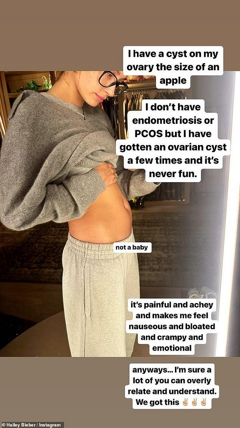 英国那些事儿 周一,海莉·比伯在社交网站上分享了一张对镜自拍的照片,她掀起自己的上衣,露出些微凸起的腹部,通常女星特意展示小腹,都是要宣布怀孕的喜讯,但海莉刚好相反,她肚子里的不是宝宝,而是卵巢中一个苹果大小的囊肿......