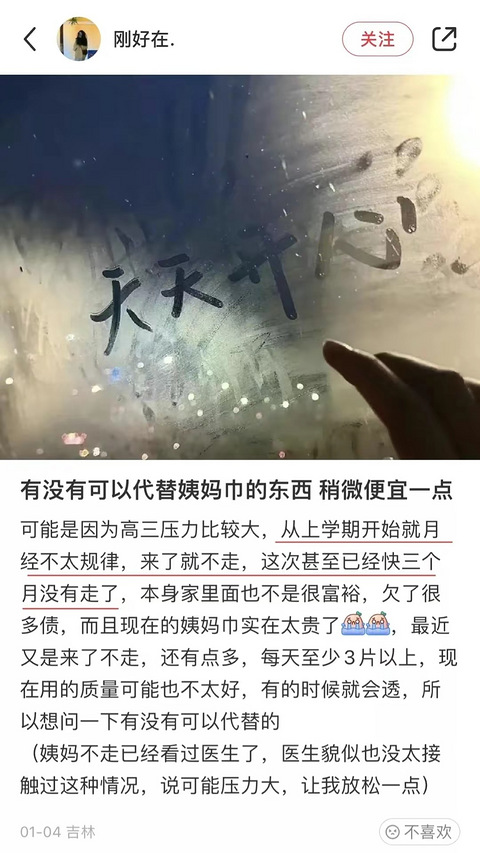 近日,有网友在小某书上发了一则热帖,看得让人心酸又心疼。她的标题是:“有没有可以代替姨妈巾的东西,稍微便宜一点。” 头趣知识