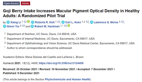枸杞真能明目!加州大学临床研究发现,每天28g枸杞或有助于防止年龄相关的黄斑变性,效果比保健品好。转自奇点网。 时珍曾经曰过,枸杞可以明目。 害,李时珍原话不一定是这么说的,不过《本草纲目》枸杞那一条下面,的确有着明目安神的记载。 那么“明目”到底是个啥,枸杞到底有啥好处呢? 近期,加州大学戴维斯分校科研团队在营养学杂志Nutrients上发表了一项小型临床研究的结果[1],研究者们发现,每周5天