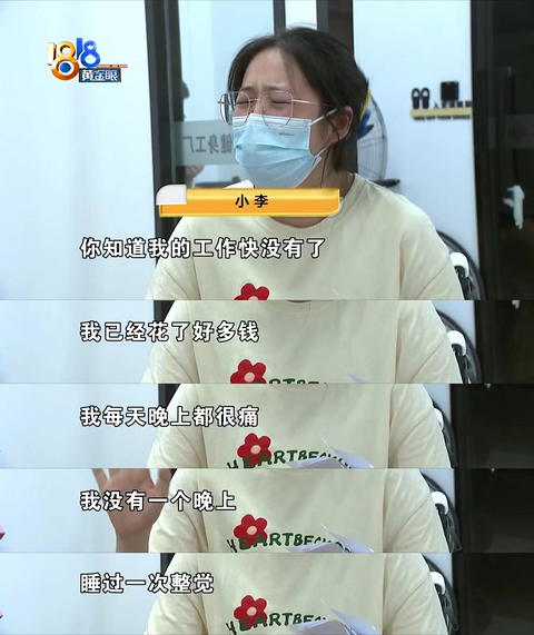 1818黄金眼 小李反映,她在健身房上私教课,做了几组“倒蹬”动作后,现在只能坐在轮椅上,采访时小李直接崩溃了。小李:“你知道我的工作快没有了,我已经花了好多钱,我每天晚上都很痛,我没有一个晚上睡过一次整觉。”