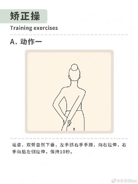 4招有效改善圆肩驼背长期伏案工作,低头玩手机,脖子僵硬、肩颈酸痛、圆肩驼背等问题成了现在大多数人的困扰。今天教大家4个动作改善圆肩驼背(详情看图)动作一:站姿,双臂自然下垂,左手抓右手手腕,向右拉伸,右手向后左侧拉伸,保持10秒。动作二:站姿,双臂自然下垂,左手抓住右手手肘,保持10秒,右手抓住左手手肘,保持10秒。动作三:站姿,抬头挺胸,打开双肩,双手向上牵引贴合,保持10秒,在慢慢放下来。动