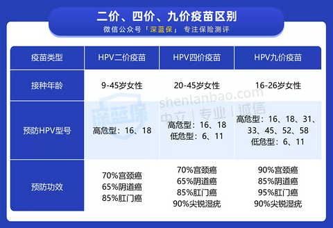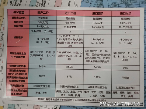 根据 HPV 疫苗预防的病毒类型,它可分为二价、四价和九价。不同价的疫苗,适用人群和预防效果也不同。很多人都觉得要打9价的才好,然而并不是。 网上看到一个详细表格,来看看2价、4价、9价的区别