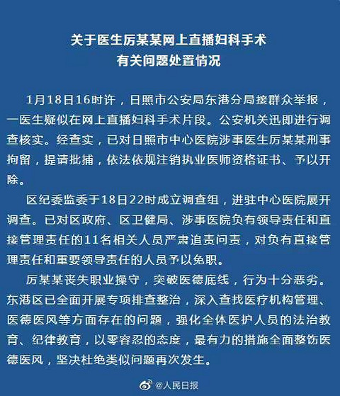 1月21日,山东省日照市东港区宣传部发布通报称:1月18日16时许,日照市公安局东港分局接群众举报,一医生疑似在网上直播妇科手术片段。日照市公安机关迅即进行调查核实。经查实,已对日照市中心医院涉事医生厉某某刑事拘留,提请批捕,依法依规注销执业医师资格证书、予以开除。日照市东港区纪委监委于18日22时成立调查组,进驻日照市中心医院展开调查。已对日照东港区政府、日照东港区卫健局、涉事医院负有领导责任和