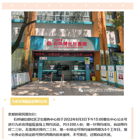 石桥铺街道社区卫生服务中心将于2022年8月3日下午15:00整在中心公众号进行九价宫颈癌疫苗线上预约活动,共计200人份;第一针预约成功,自动预约好二三针。无需再次预约二三针,第一针给定可预约接种周期为5个工作日,第一针务必在给定的可预约周期内前来接种,不可推迟,过期自动失效。