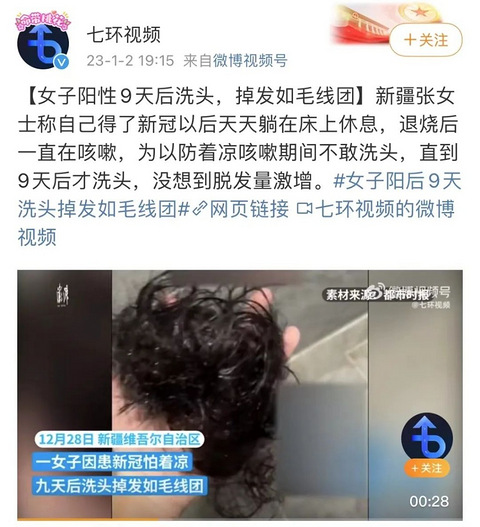 阳康后掉头发是怎么回事?前几天有个热搜 #女子阳后 9 天洗头掉发如毛线团#,看了视频,还挺吓人的。研究表明,感染新冠后,确实有一部分人会出现脱发。但阳康后短期内出现的“脱发”,很可能属于正常现象。 人平时每天要掉 50~150 根头发。阳了之后,洗头洗澡的频率变低了,本来该掉的头发攒在一起掉,看起来就会比较恐怖。 坏消息是——真正严重的脱发,往往发生在阳后 2~3 个月,称为“休止期脱发”。 什