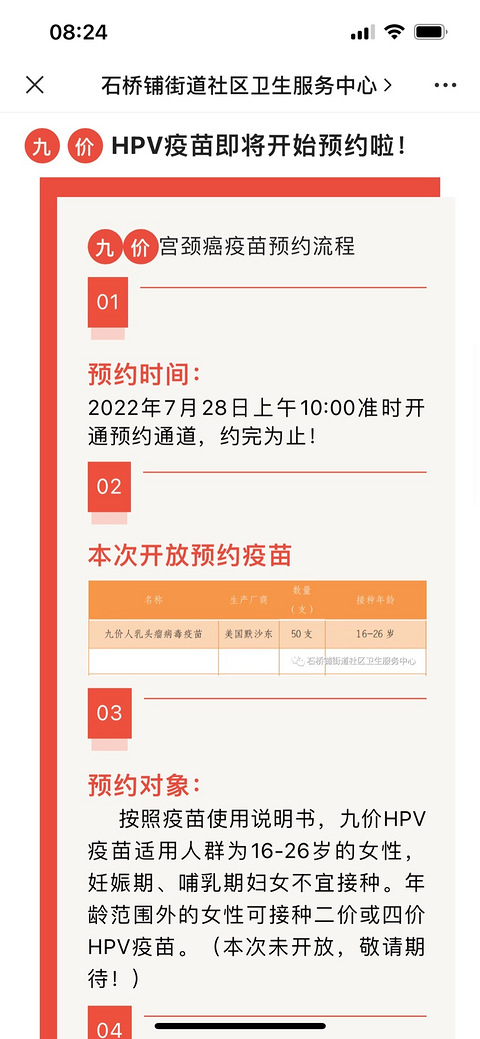 7月28日10:00抢石桥铺社区服务中心九价疫苗,不限户籍!