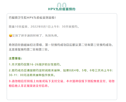 巴福镇卫生院HPV九价疫苗到苗啦!限量10支疫苗,2022年8月1日上午8:30开放预约。