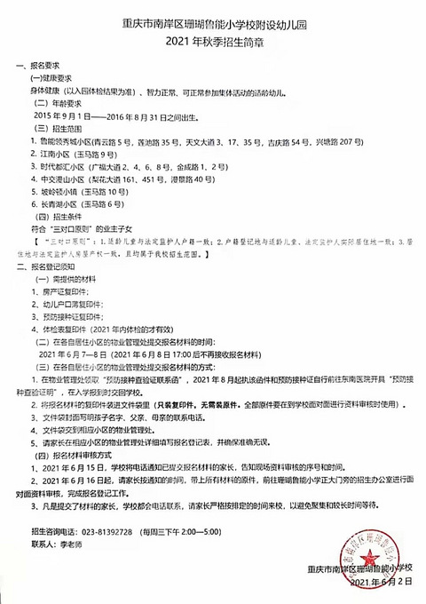 南岸区鲁能小学附属幼儿园招生开始,需要三对口