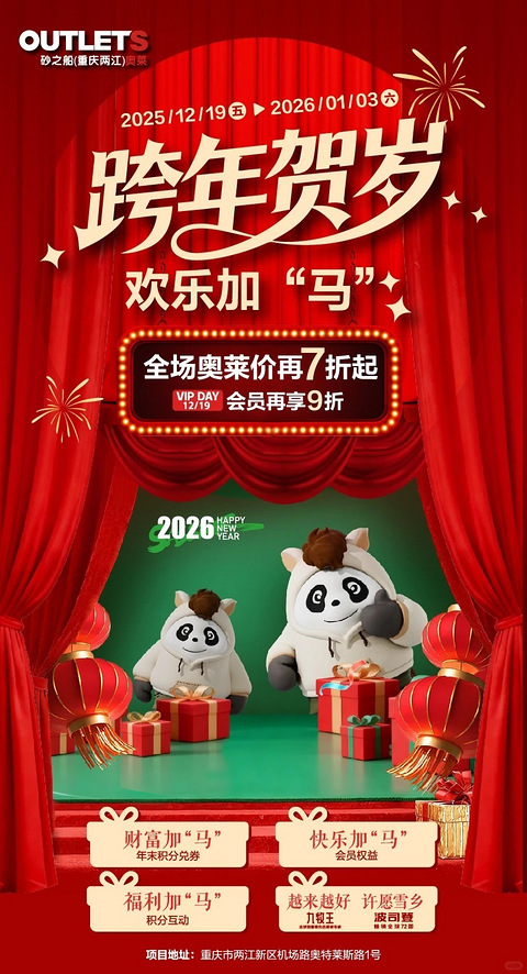 12.19-2026.1.3“跨年贺岁 欢乐加‘马’” 活动即将上线!全场奥莱价再 7 折起,12.19VIP 日会员还能叠 9 折,这羊毛不薅亏大了!还有积分兑券、会员权益这些 “加马” 福利,顺便还能冲九牧王 / 波司登的许愿雪乡~