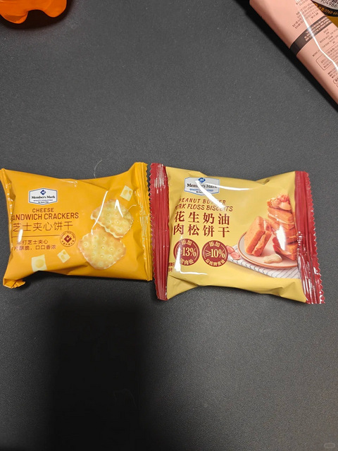 都是山姆可以买到的。因为本人真的很爱闲咸趣饼干,然后山姆的这个芝士夹心饼干就是两片类似咸趣饼干中间有芝士夹心,又不是那种非常甜,就真的酥脆+鲜香到飞起!属于我的每日下午茶小零食top1 然后那个花生奶油肉松饼干,她那个外面两片饼干是类似酥脆版花生压缩饼干,有一些些咸味,中间夹心是奶油+固态肉松,就是整个滋味非常丰富,超级适合喝咖啡的人当做咖啡茶点!