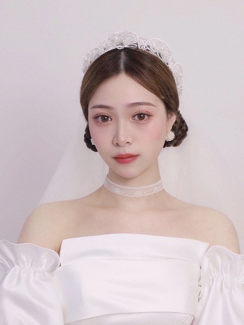 分享一个可爱的少女新娘,这个妆容的唇色也好温柔~狙击少女心的高级甜美系新娘妆容,淡然却恰到好处,发型上选择的是可爱的双丸子,配上小清新珍珠皇冠,满屏都溢着甜美的少女气息