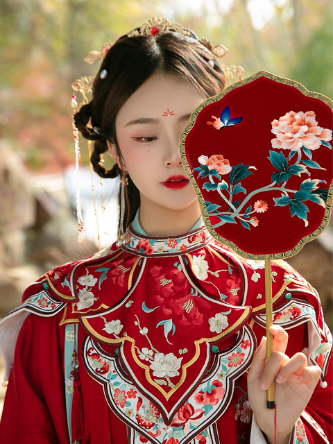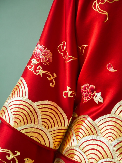 重磅真丝手绣嫁衣,以盘金绣为主,华丽隆重。牡丹花以丝线绣制,盘金勾边。如果你想收藏一件嫁衣,传统的版型是非常适合了。连肩袖宽松舒适,活动方便,哪怕30年后传给女儿都不会过时