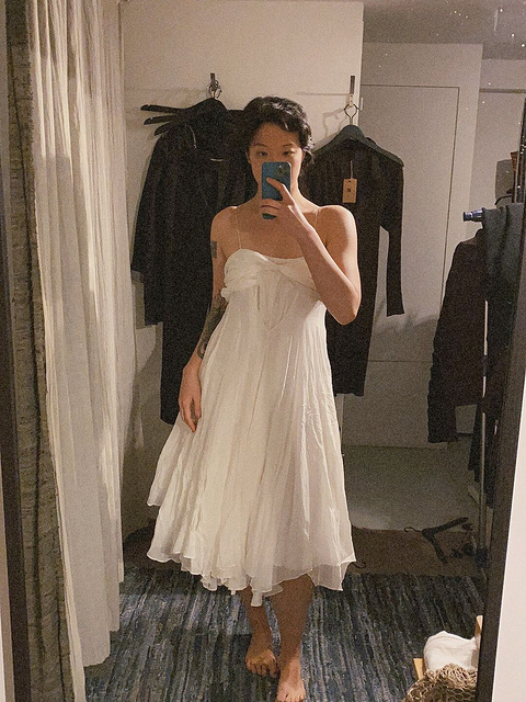 在二手时装店逛,老板特别好,给我看这条裙子,虽然还没熨过,但一眼看上了,七八层轻轻薄薄的棉,简洁但不简单。这是内心干净的仙女(就是我本人)穿的裙子吧!old celine,结婚一定要穿上它