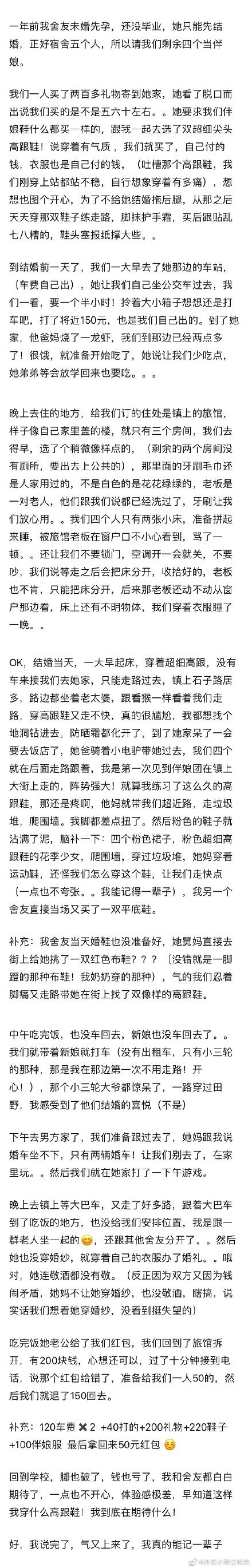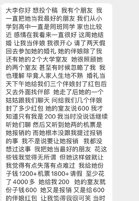 咱就是说,最好的关系就是用来消耗的吗? 网友投稿:去参加最好的朋友的婚礼,她给另外两个伴娘600红包并报销车费,给我200红包没提报销的事。说我们两个是最好的朋友 不在意这些 。 ???