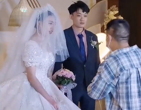 在江苏徐州某婚礼现场,一对新人正在举行仪式。原本一切都挺顺利的,但是到了伴郎送戒指的环节,却让大家忍不住都笑了。只见伴郎走上台以后,直接就对着新娘单膝跪地,然后把手中的戒指给亮了出来,这架势就好像是求婚一样。旁边的新郎原本还有点困困的样子,看到这一幕瞌睡都直接吓醒了。
