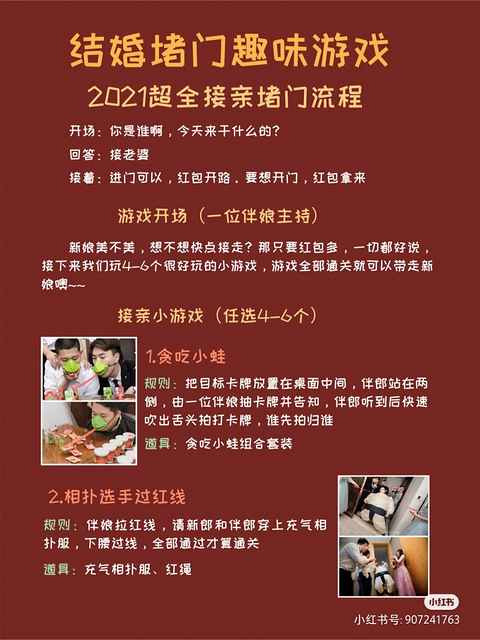 在备婚的小伙伴们,快快看过来!! 结合2020年参加的约5场婚礼,以及自己平时关注的小攻略,总结了这份超全的结婚堵门流程和小游戏 接亲游戏(任选4-6个)增加趣味性V拒绝恶俗X 1.贪吃小蛙 2.相扑选手过红线 3.吃糖诸葛帽 4.烈焰红唇 5.百发百中 6.模仿顽皮豹 7.电臀达人 8.东成西就 9.挤眉弄眼 10.开口吹蜡烛 11.夹住钞票