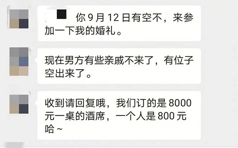首先说明不是本人收到的,是朋友收到发给我吐槽的,我看了一整个无语…这简直是情商洼地了吧…明码标价800一位,你搁这找人aa酒席呢?有这钱吃点什么不好