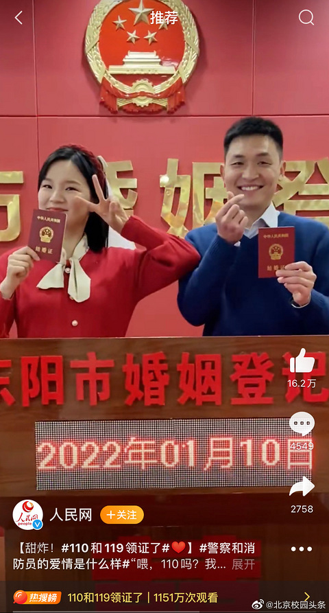 110和119领证了,警察和消防员的爱情是什么样,“喂,110吗?我是119,有本证一起领下!”1月10日,浙江东阳一对特殊的新人领证了。新娘是东阳市民警任倩妮,新郎是无锡市消防员包建邦。因为彼此职业工作原因,他们聚少离多。2021年7月台风“烟花”突袭东阳,任倩妮始终坚守在防汛第一线,同一时间,河南新乡受暴雨袭击,包建邦带领11名队员赴豫驰援...当“警察蓝”与“火焰蓝”相遇,他们的爱情注定不同