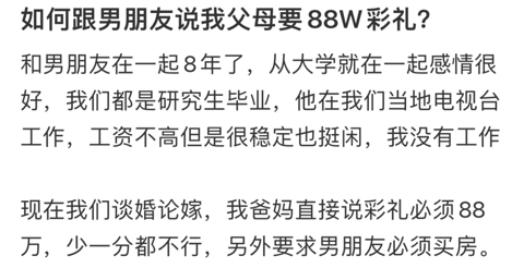 你的结婚彩礼是多少? 彩礼是个老到不能再老的话题,每次聊到彩礼收不收、收多少,都会引起一轮又一轮的争论,因为彩礼谈崩的爱情数不胜数。有很多情侣熬过了风风雨雨,却熬不过一份彩礼。 某些地区“天价数目”,动辄十几万几十万,成为很多普通家庭的负担