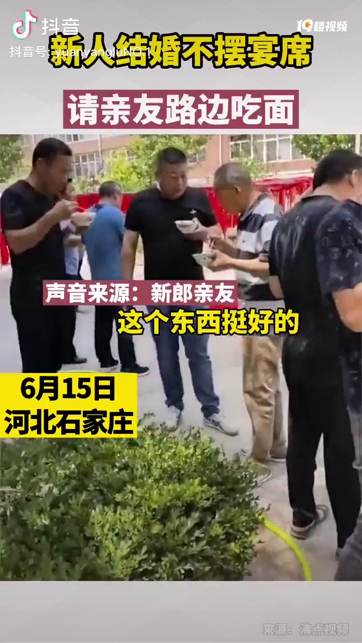 6月15日,河北石家庄。一对新人举办婚礼却不摆宴席,在路边摆起碗筷,请亲友们吃饸烙面。视频中,已经做好的大盆面条、碗筷等餐具都在地上放着,不少人端着面条站在路边吃。据男方亲友介绍,两位新人举行的是旅行婚礼。