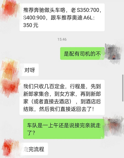 经过深思熟虑及双方父母商量(软磨硬泡),决定了路线是这样的新房(新郎出发)--酒店(新娘)--饭店(宴会厅)。新房去酒店是11公里(20分钟路程),酒店和饭店就是一路之遥,过马路就到饭店了。本来就觉得车队可有可无,然后今天问了一下车队的价格,以及得知婚车是走完流程就回去了(新郎--接新娘--新房--酒店)。但是我们的路线只需要把新郎从新房送去酒店接新娘就结束了。这种情况下,我有了一个大胆的想法,我