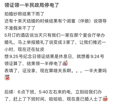 领证领到一半民政局停电了,这天怕是终身难忘了
