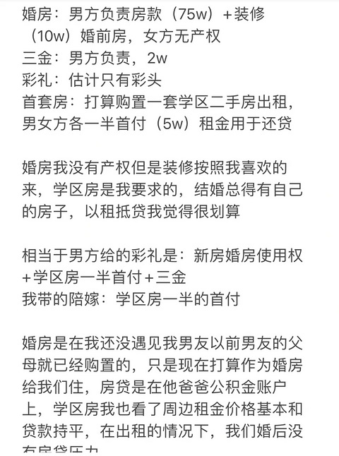 男方一个有贷款的房子,结婚不要彩礼,只买三金和衣服,酒席钱男方出,女方不陪嫁任何嫁妆,让男方买一辆车,写在男方名下,房房贷车子和女方无关,女方开车自己加油钱,婚后只要保证女方有三餐,住的地方,个人赚的钱个人花,不要想花对方一毛钱,各自父母各自赡养,如果有小孩了,男女各半,女方在男方家啥事都不干,假设离婚,小孩归女方