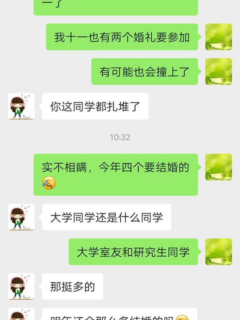 这几天陆续收到了同学好友的伴娘邀约,然后基本都是五一和十一结婚,五一的撞了俩,只能去一个了,十月的目前确定一个日子,另一个具体还没定下来但国庆节期间结婚无疑了,是不是今年特别适合结婚???大家都今年扎堆结婚吗???