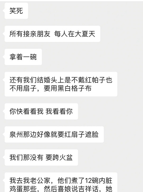 同事是厦门人,听她给我讲,她那时结婚晚上接亲,而且还要吃一大碗鸡蛋,迎接当天,还要穿一件白衬衫在婚服里。我觉得太神奇了!而且她老公提着灯和鸡来娶的!结婚新娘头上还要插松柏茉莉、吃饭要打满满一碗饭,只能吃三口,吃过给婆婆吃,婆婆要吃完。如果好友同一年结婚就不能参加对方的婚礼。这是为什么啊?!!而且为什么要晚上接亲?真是让我打开眼界,你们老家结婚有什么习俗吗?