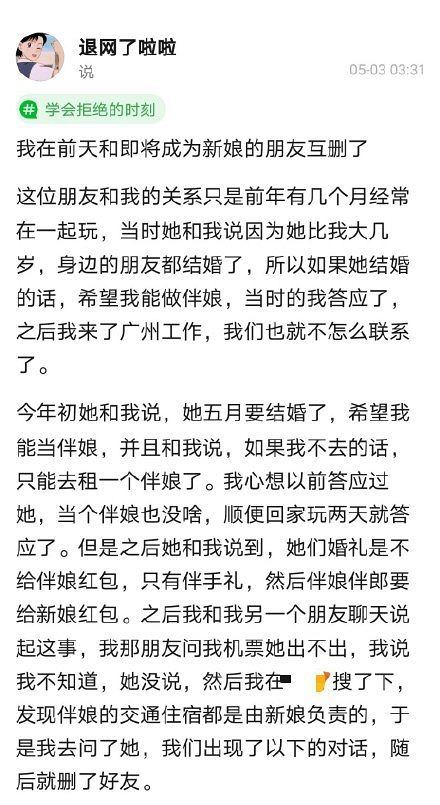 因“和即将结婚的朋友互删了”,一位网友当“伴娘”的奇葩经历在网络上引起热议。从该网友的描述可以看出,双方近两年联络并不紧密,“之后我来了广州工作,我们也就不怎么联系了。”
