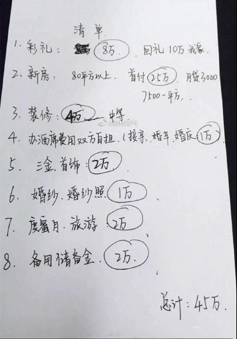 看到有个男网友文说就要结婚了,而女友列出的“45万婚礼清单”让他很崩溃,甚至吐槽现在的女孩子怎么都这样虚荣、爱攀比!这是网友的原文: 说要去见女朋友父母了,结果去的前一天她跟我说,这次去就是要谈婚论嫁的地步,先跟我把结婚的事说好这样在他父母面前就不会很突然,然后晚上她就给我写了张单子我们为这个吵架了,其实我觉得独生子女结婚什么的最好算了,又不会有什么财产纠纷,他父母的,我父母的,以后都是我们两个的