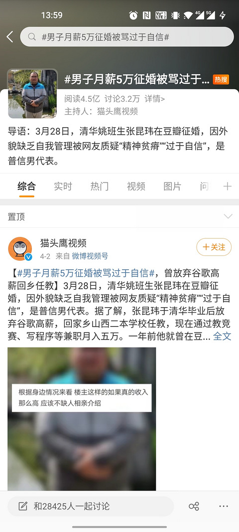 不晓得大家看到这个热搜没,“男子月薪5万征婚被骂过于自信”,不懂大家为什么要骂他,光看标题我还以为他提出了什么很过分的要求,例如要求女生倾国倾城貌若天仙或者富可敌国之类的呐…… 结果,真是只是普普通通的一个征婚,甚至要求只是愿意在山西一带发展 …… 这个征婚怎么看都属于有点卑微的意思了,怎么还能上升到普却信了呢?