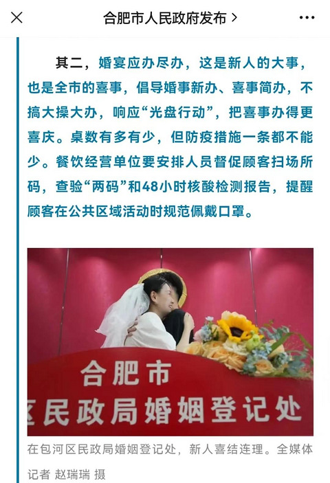 取消区域全员核酸后,合肥倡导婚宴应办尽办