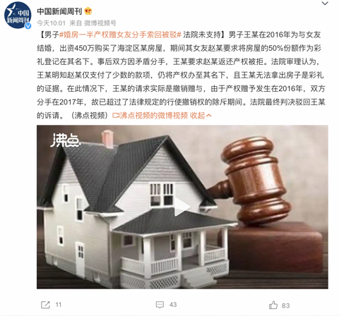 男子婚房一半产权赠女友分手索回被驳:不要高估你们的爱情和人性