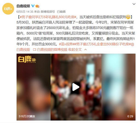 男子偷同学2万5彩礼随礼500元吃席,被抓后查出是前科犯现获刑
