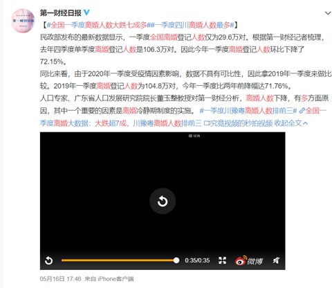 根据民政部发布的最新数据显示,一季度全国离婚登记人数仅为29.6万对,相比去年同时期,离婚率下降超七成。