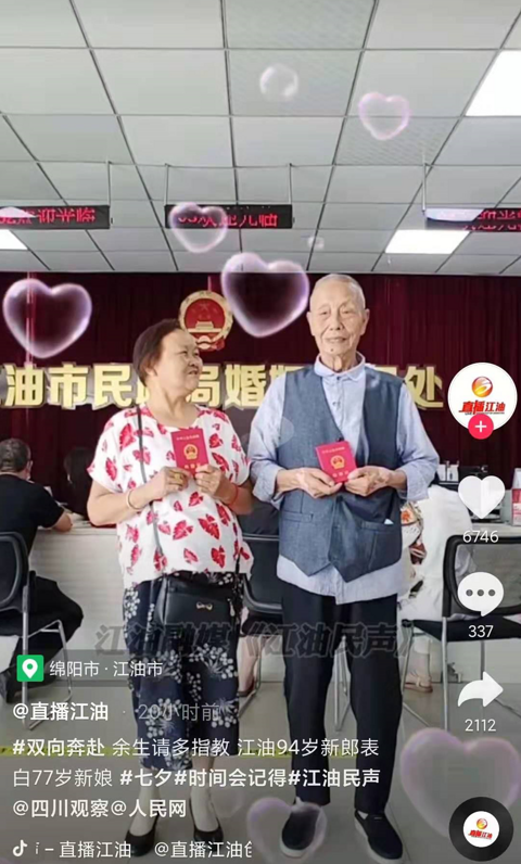 四川一对老人结婚,新郎94岁,新娘77岁!网友评价七夕最幸福的人