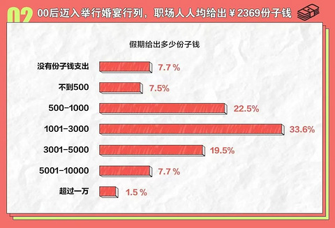 随着00后这届「后浪」迈入举行婚宴的行列,更多年轻人不得不面临「随份子」这一亘古难题。而礼金的水涨船高,也让不少人感叹,「随不起份子了」。《2022职场人国庆长假调查》数据显示:职场人在今年国庆期间给出的份子钱,人均高达2369元。其中,给出1001-3000元的职场人最多,占比达到了33.6%! (来源:后浪研究所)