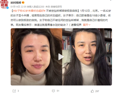 结婚是否为女性走向“自我牺牲”的悬索桥?单身又是否为适配每位女性的理想路?近年来,网络各社交平台中网民针对女性婚育选择的问题争议纷纷。1月14日,一则“女子称42岁未婚状态超好”的新闻更是引起网友热烈讨论。