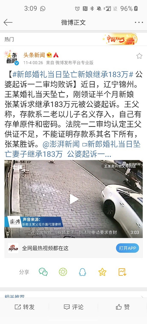 今天看到一则社会新闻,本来以前对这类新闻不太感冒,但是看完是在令人气愤就是老两口有一个独子,他们把财产都是放在儿子名下的。儿子领了结婚证,然后婚礼当天坠亡,他们直接就变失独了。然后他们的儿媳,在他们儿子尸体还在殡仪馆的时候就开始准备要钱了。他们儿子刚死三天,儿媳就起诉要封银行账户和财产去分割。老两口没想到儿媳做的那么绝,去打官司,然后输了。