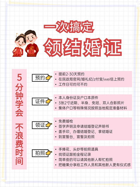 一、提前准备领证材料确定领证日期后,满足领证条件的新人就可以开始准备办理结婚登记时需要的证件,证件齐全才能顺利领证。 结婚证办理需要什么材料?1、双方当事人的户口本以及身份证原件、复印件2、双方当事人之间无直系血亲关系以及三代以内旁系血亲关系声明3、三张近期免冠半身红底双人证件照,两寸4、若一方为再婚者,还应携带离婚证或法院出具的离婚判决书5、若一方当事人为港澳台同胞,须持有内地往来通行证、回乡证