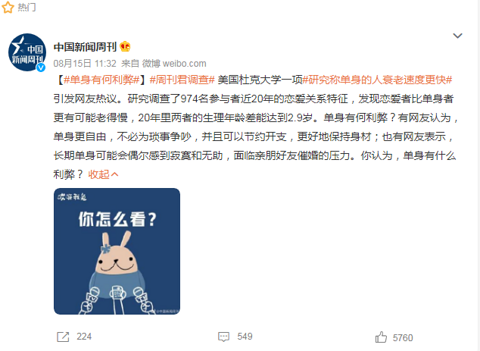 单身一时爽,一直单身一直爽。这句被很多单身者拿来自我调侃的话,眼看着就要被推翻了:有研究显示,单身的人衰老速度更快。 美国杜克大学一项研究称单身的人衰老速度更快引发网友热议。研究调查了974名参与者近20年的恋爱关系特征,发现恋爱者比单身者更有可能老得慢,20年里两者的生理年龄差能达到2.9岁。单身有何利弊?有网友认为,单身更自由,不必为琐事争吵,并且可以节约开支,更好地保持身材;也有网友表示,长