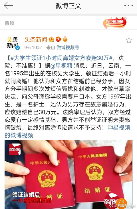 近日,云南昆明。昆明市西山区人民法院审结一起案件:一对小夫妻刚领证一小时男方就要离婚,女方不同意,双方因此对簿公堂。1995年出生的项某现就读于昆明某职业学院,他认为:在和女方在结婚前其实已经分手,两人感情破裂。结婚是因为女方在分手期间多次发短信骚扰和刺激他之后,他才做出了草率决定。1997年出生的陈某是昆明某口腔医院有限责任公司的护士,她表示:若离婚要求项某对其进行赔偿30万。 对此,法院认为: