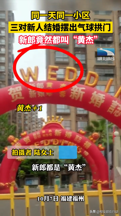 近日在福建福州的某小区,出现了让人难以置信的一幕。从媒体资料中可以看到,有三对新人结婚摆出的气球拱门,但是所有的拱门上面写的新郎的名字相同,都叫“黄杰”,而新娘的名字却各不相同。